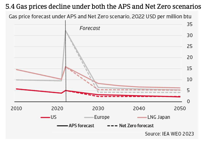 Se prevé que la demanda de gas crezca en Asia-Pacífico, Oriente Medio y África hasta 2030 y que después empiece a disminuir. Se prevé que en EE.UU. y Europa disminuya la demanda de gas tanto a medio como a largo plazo.